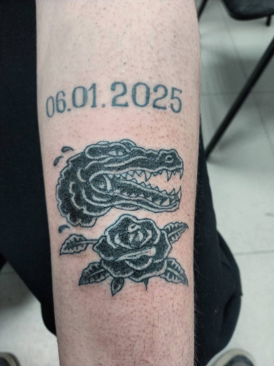 Очень интересное стилизованное, черно-белое изображение розы и крокодила. Немного напоминает стиль «Олд Скул», но точно отнести к нему нельзя, в общем, прекрасный полет фантазий художника.