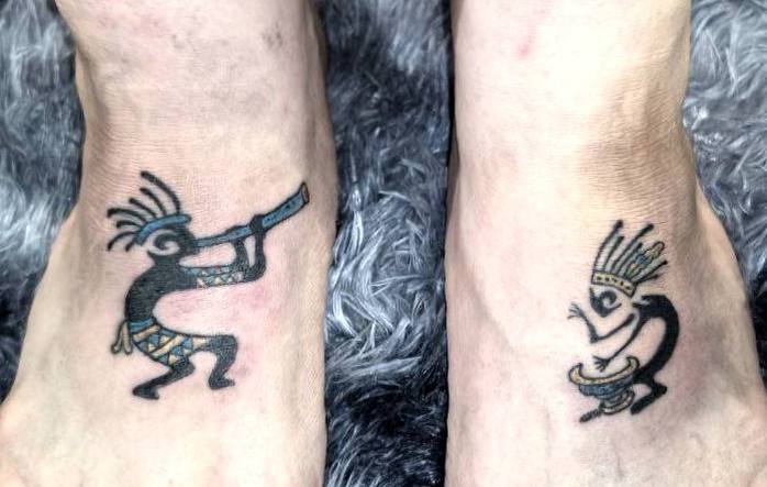 Парная татуировка, сделанная на двух ступнях. На ней изображены обращенные к друг другу два музыканта. Рисунок выполнен в лаконичной графической манере, свойственной изобразительному искусству южно-американских индейцев.